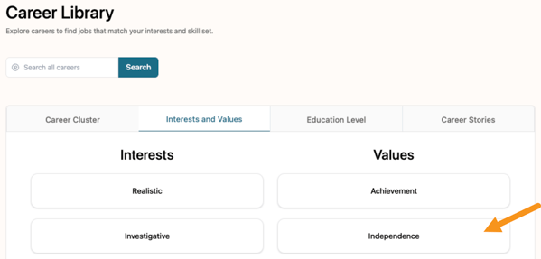 On the Career Library page, the Interests and Values tab showcases all the careers by their respective Interests and Values. Select an Interest or Value by clicking on the tile.